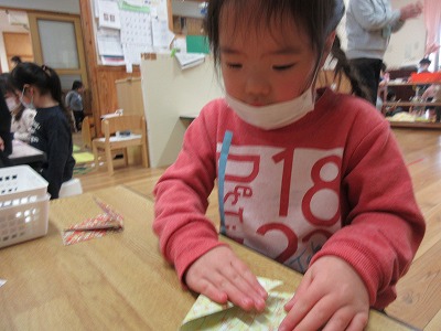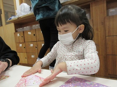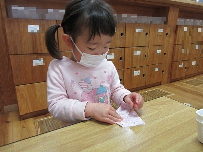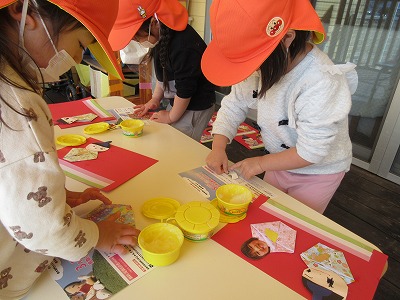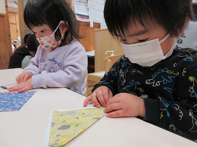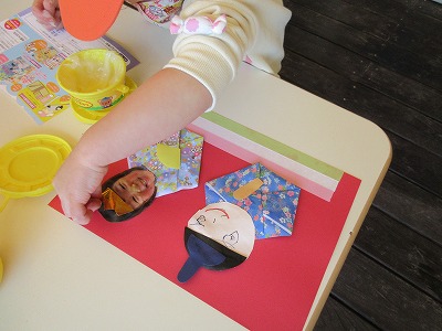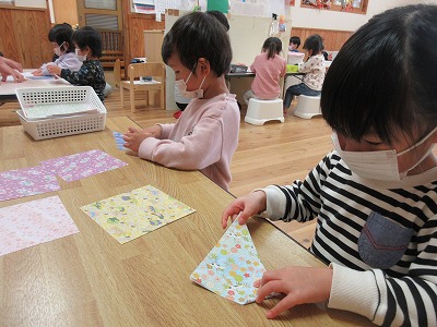 桃の節句が近づいてきました…。うさぎ組の子どもたちと一緒にお雛さま作りを行いました!