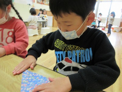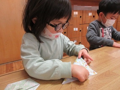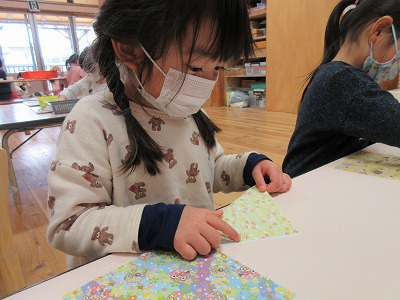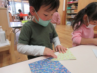 折り紙を折って、着物作り…。指のアイロンでギューッと押えて、しっかり折り目を付けていきます。