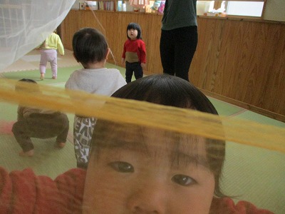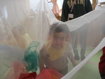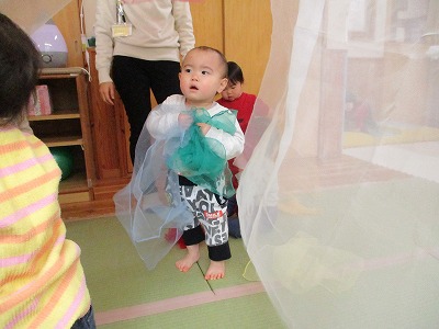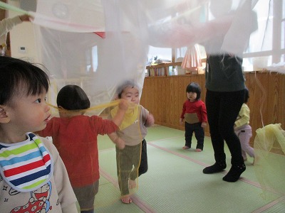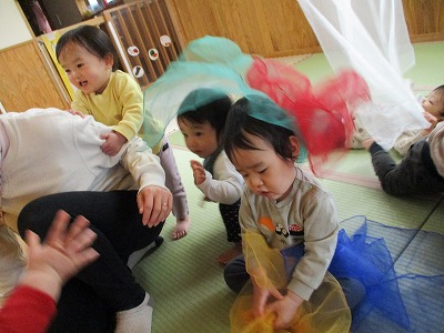 わらべ歌の時に使っている”シフォン”で遊びました。さらさらしていて、触り心地がシフォンをたくさん集めたり、上に投げたりしていますよ。
