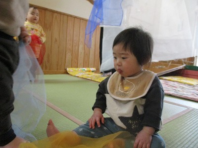 「わぁ、これはなに?」と興味津々でシフォンの下に入ったり、小さいシフォンを上においたりして楽しんでいますよ。