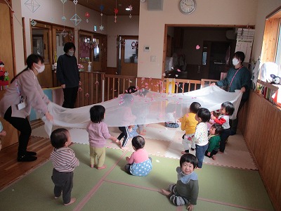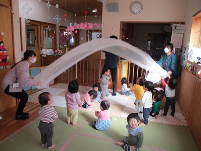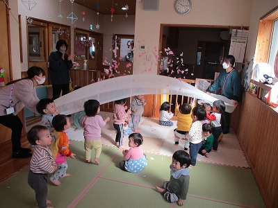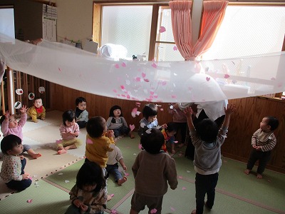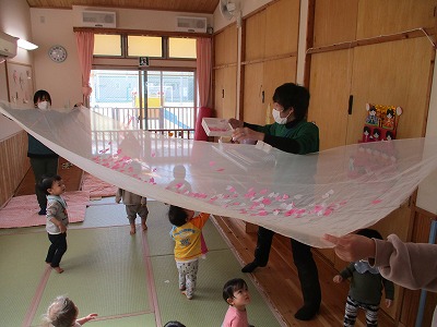 その後は桃の花の形に切ったお花紙を大きなシフォン(布)にのせて