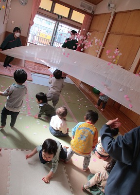 ひらひら落ちる桃の花びらに手を伸ばす子どもや、シフォンの下から花びらに手を伸ばす子どもたち。