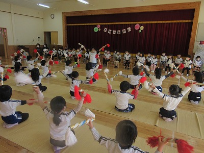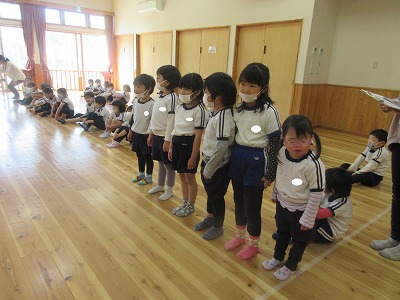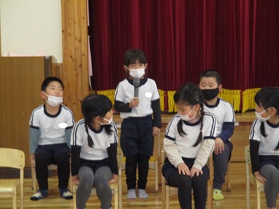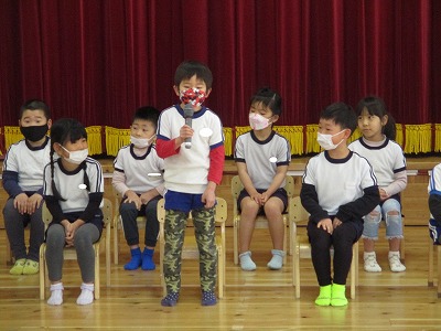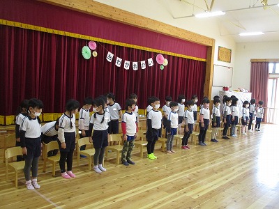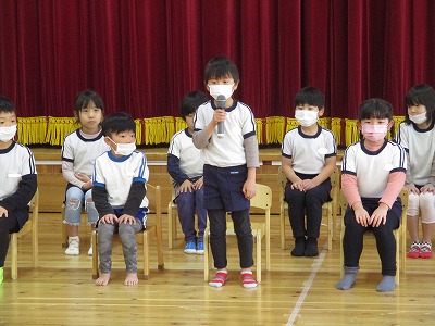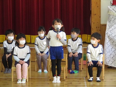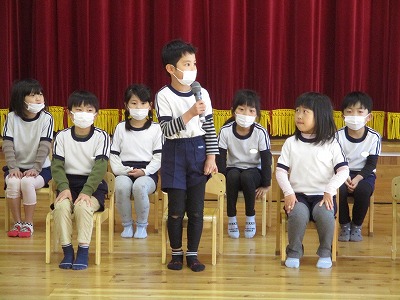 最初はほし組さんが一人ずつ名前と進学予定の小学校を発表しました。さすがほし組さん。堂々と発表できました♪