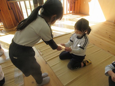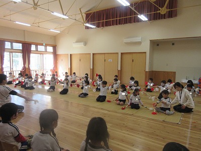 次は引継ぎ式‼みどり園の伝統である運動会の鼓隊、クリスマス祝会の降誕劇、毎日のお仕事 給食の栄養素3色仲間分けを引き継ぎました。