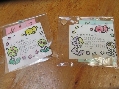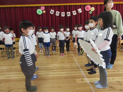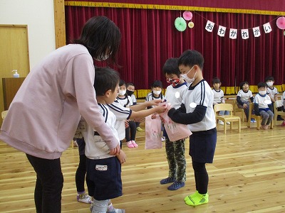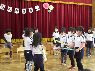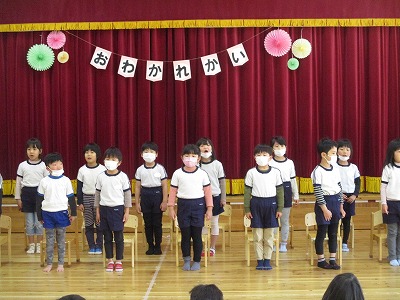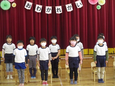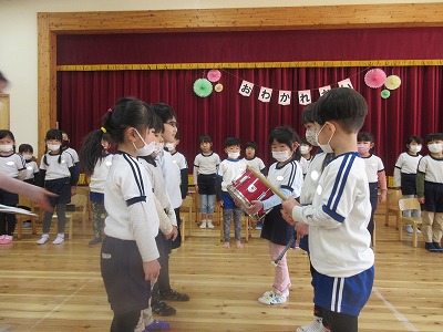 卒園式を今週末に控え、今日はほし組さんのお別れ会を行いました。コロナ禍という事で3学年集うことは出せず、今年度はほし組(5歳児)とつき組(4歳児)でお別れ会&引継ぎ会を、ほし組(5歳児)とにじ組(3歳児)は後日お別れ散歩と言う形をとることにしました。今日のために色々と準備を進めてきたつき組の子どもたち。会場の飾りも、自分たちで考えて作りました。