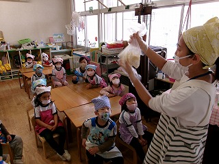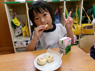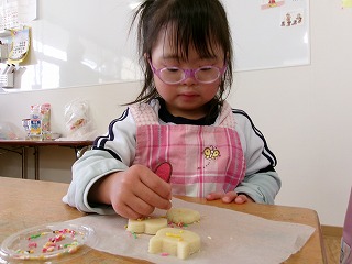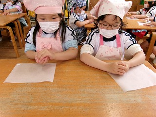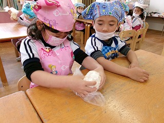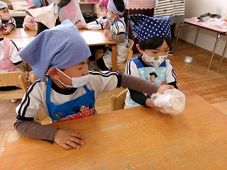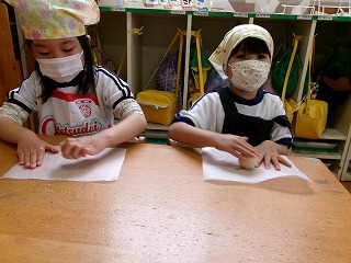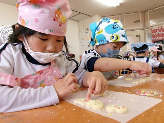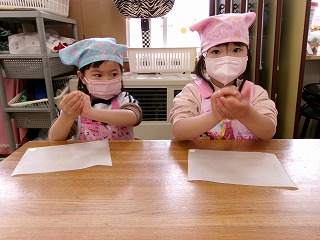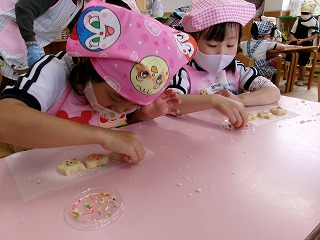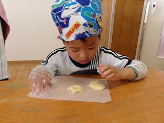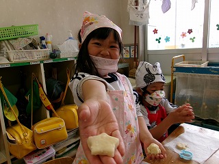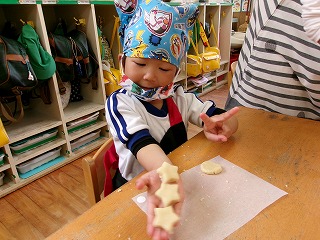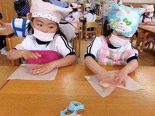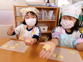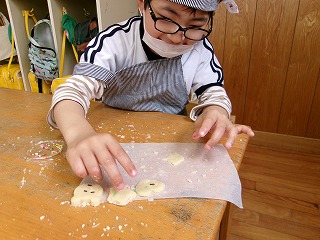 もうすぐほし組になる子どもたち。「つき組の最後にどんなことをしたい?」と尋ねると、「クッキングがしたーい‼」ということで、みんなでクッキー作りをしました。