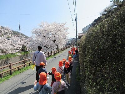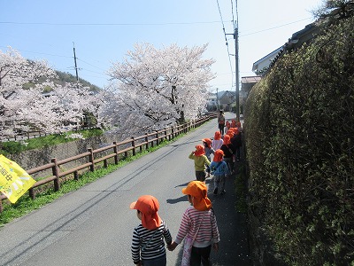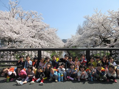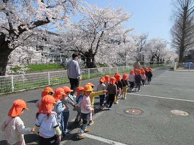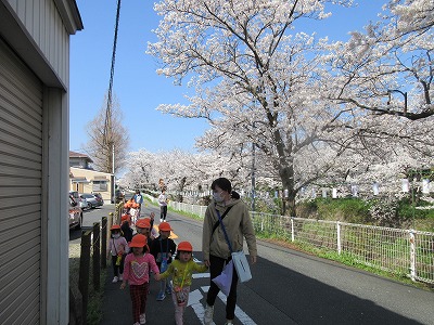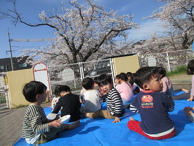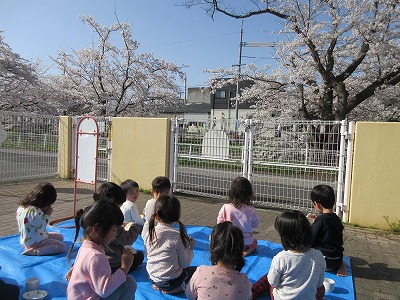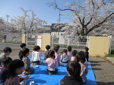 園前の桜も満開になり、気持ちのいい天気の中、桜を見ながら午後のおやつを食べた子どもたち…。