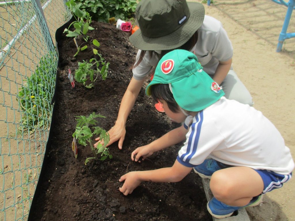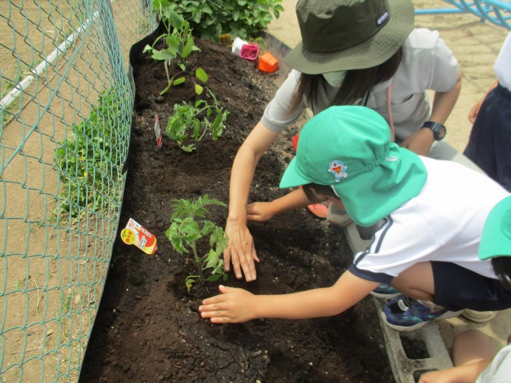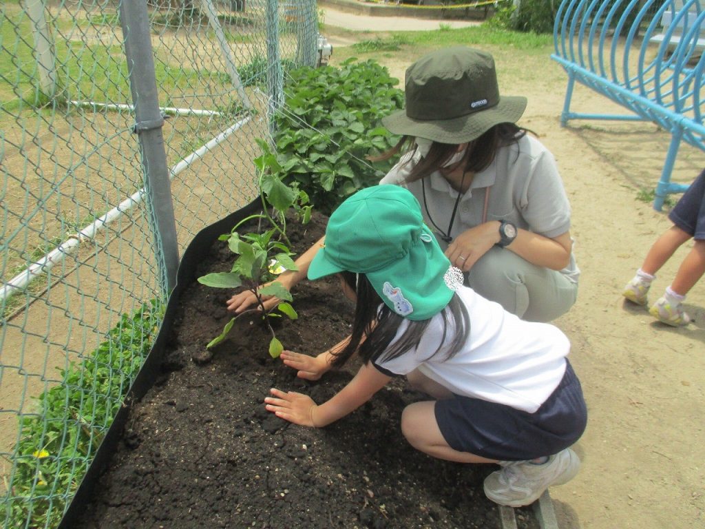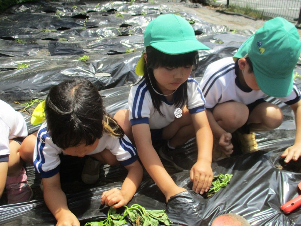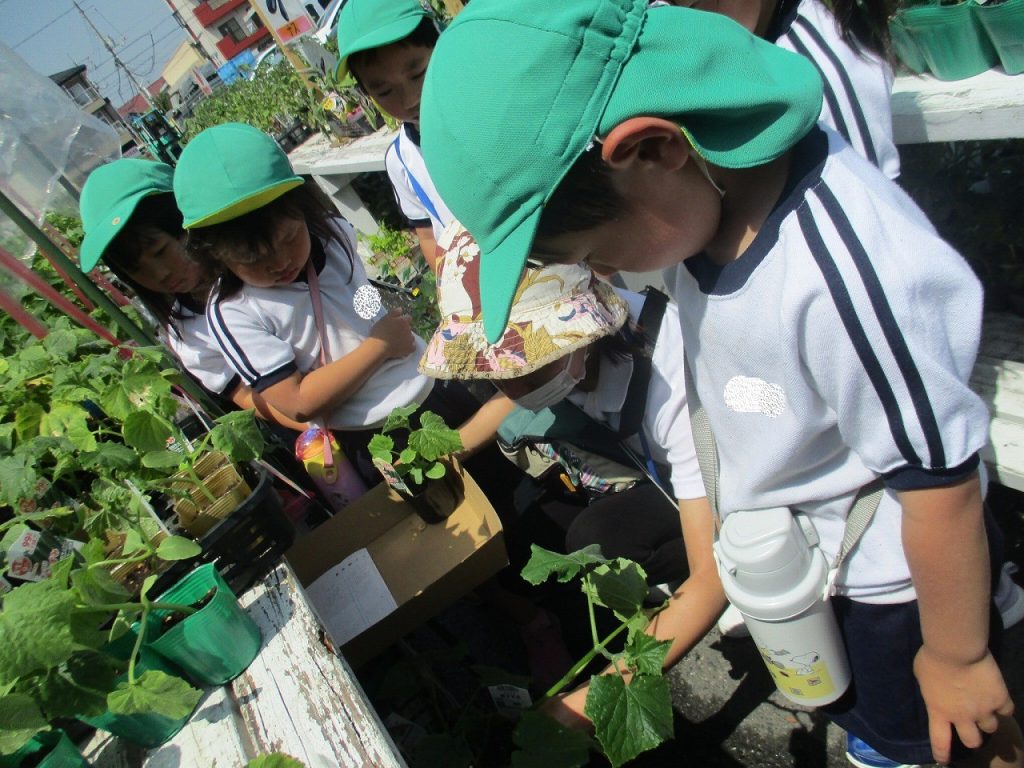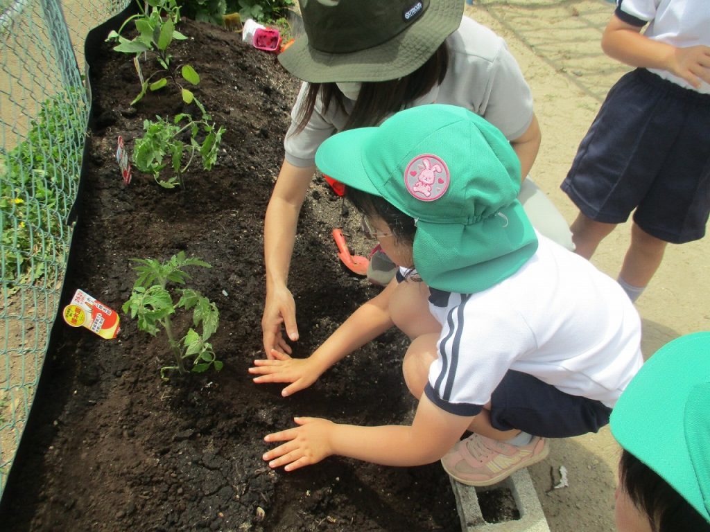 ほしぐみの子ども達は畑にさつまいも、大豆、かぼちゃ、グループごとに植える野菜は話し合ってトマト、なす、ピーマン、きゅうりを植えることになりました。