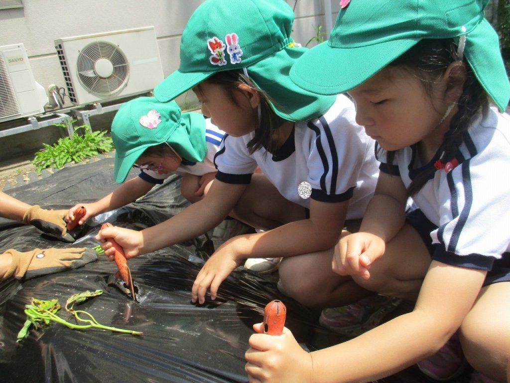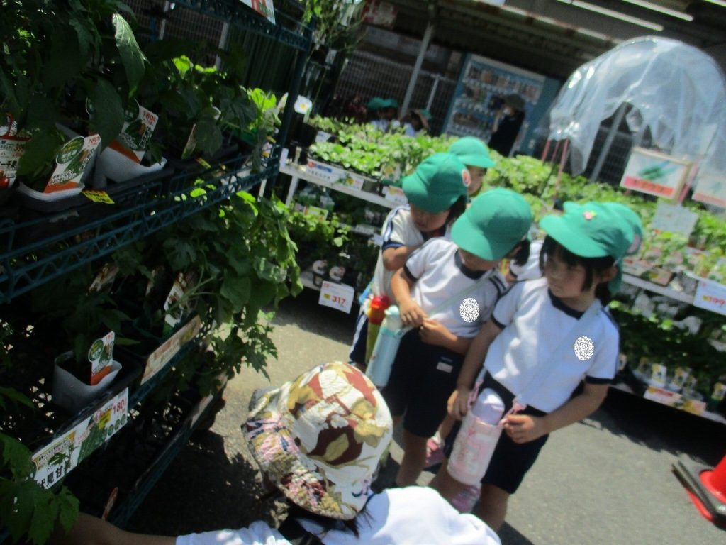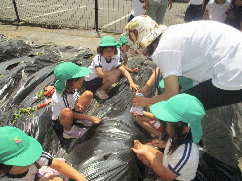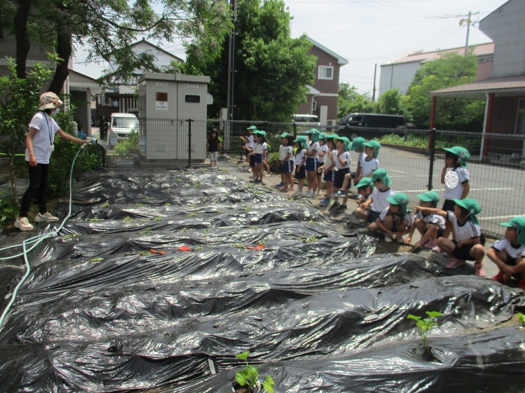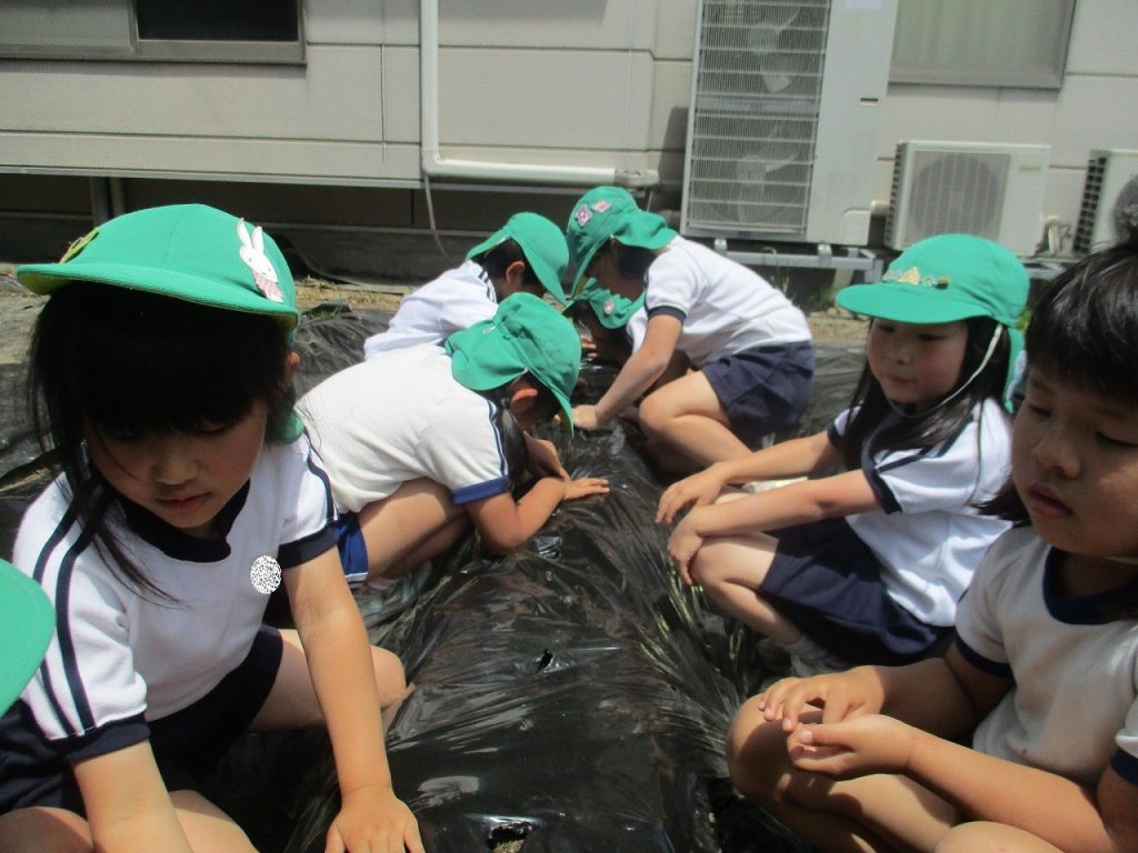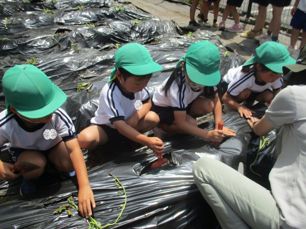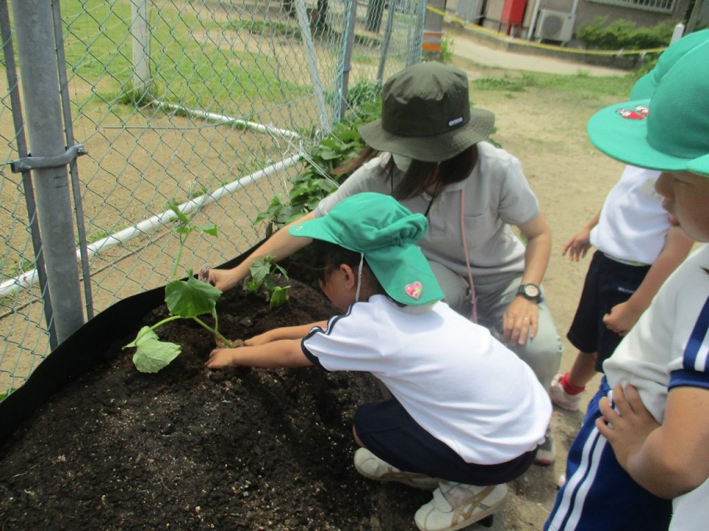 ほしぐみの子ども達は畑にさつまいも、大豆、かぼちゃ、グループごとに植える野菜は話し合ってトマト、なす、ピーマン、きゅうりを植えることになりました。
