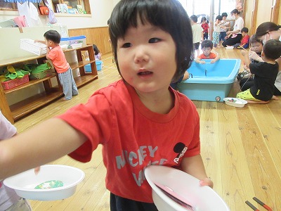 容器を出すと釣ったヨーヨーを入れ見せてくれる子どもたちです!!
