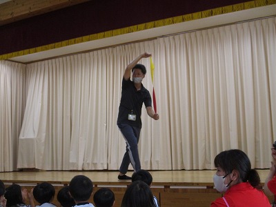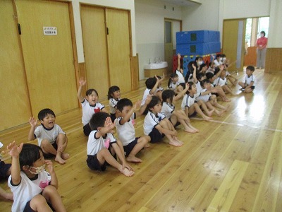 次は、お楽しみ会‼職場体験に来てくれている中学生のお姉さんの特技を見せてもらったり、保育教諭の出し物“手品”を見たりして楽しみました。ハンカチの色が一瞬で違う色に‼目を丸くしてビックリする子どもたち…。可愛すぎです♡
