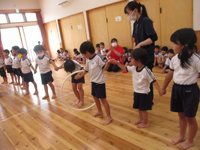 最後に、異年齢なかよしグループでフープリレーをしました。手をつないだままフープを送っていきます。簡単なように見えて意外と難しいんです‼