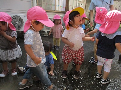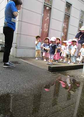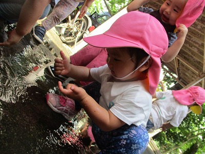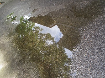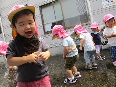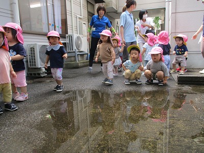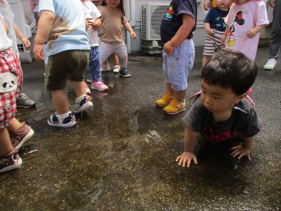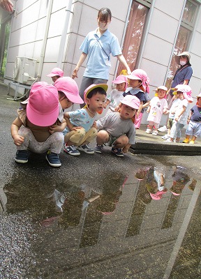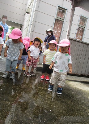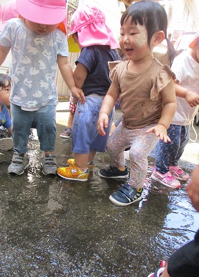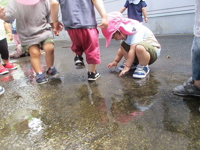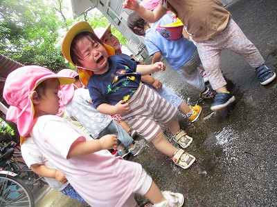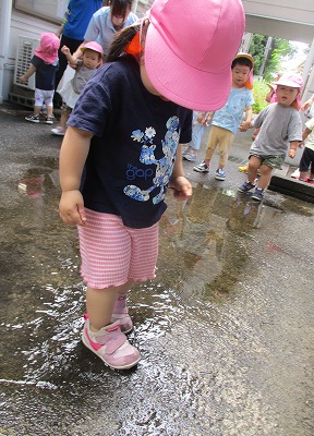 嬉しそうに水溜まりに足を踏み入れる子どもたち😆