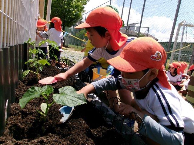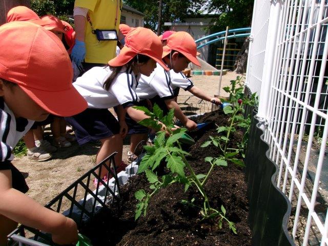 5月にみんなできゅうり、トマト、ピーマンの苗を植えました。
