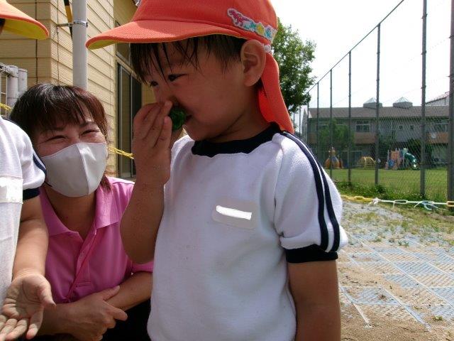 切ったきゅうりをみんなで匂ってみました!!そっと持って鼻に近づけ「きゅうりのにおいだ~!!」と笑顔いっぱいで教えてくれました(^○^)