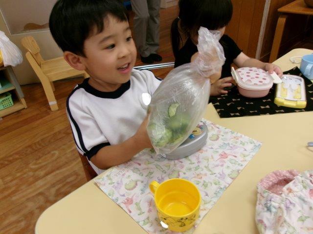 切ったきゅうりをナイロン袋に入れてぎゅっぎゅっと塩もみ!!優しくそっと握り、少しずつ汁が出てくるのを不思議そうに見つめていました。