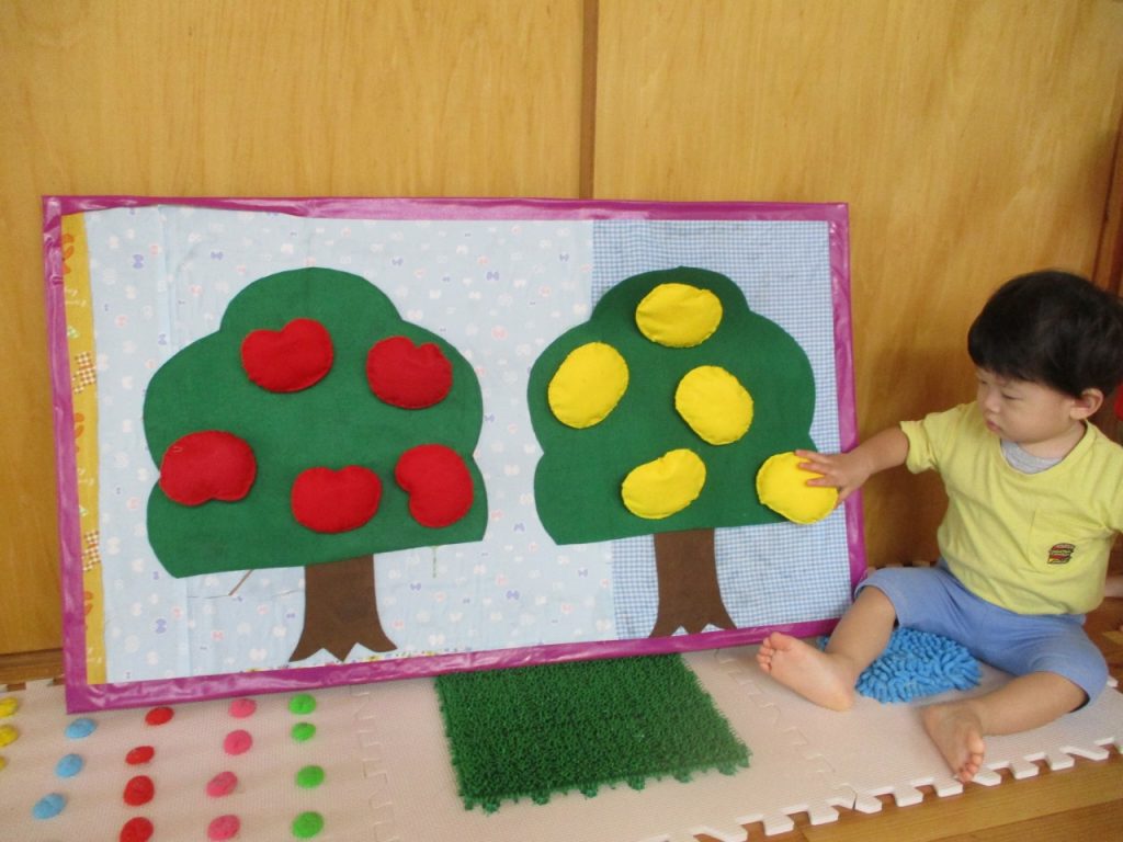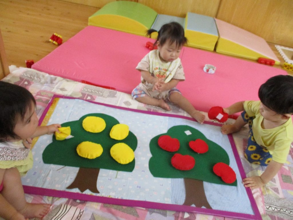 みかんやりんごを木からはがしてみたり触ってみたり…。