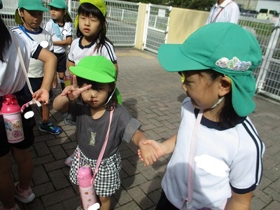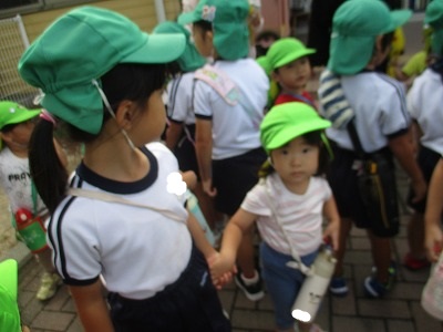 うさぎ組は二回目の散歩!ほし組のお兄さんお姉さんに手をつないでもらい一緒に出掛けることになりました。