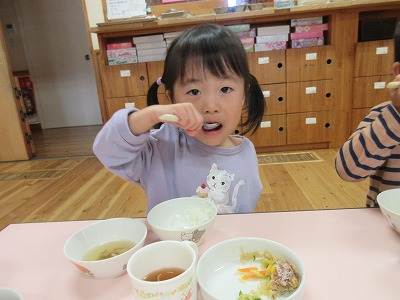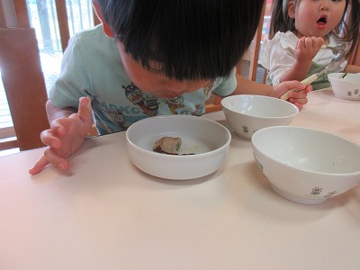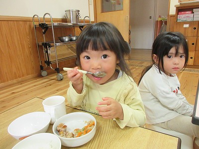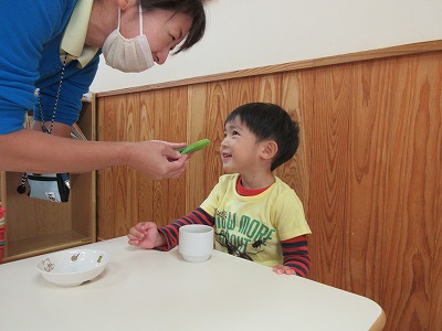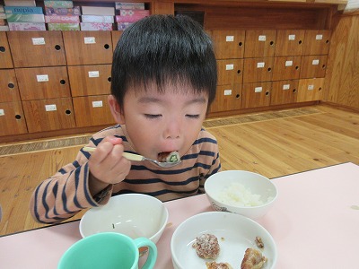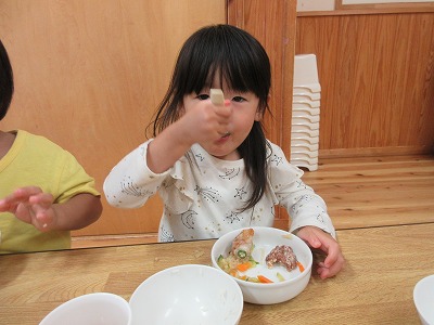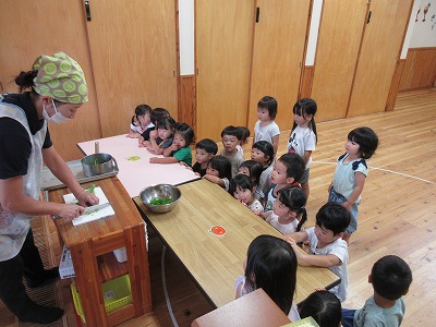 給食の先生に来ていただいて、中までちゃんと火が通っているか確認してもらいます。