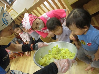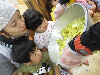 給食の先生にさつまいもをふかしてもらい、砂糖とバターをいれて…