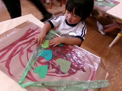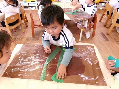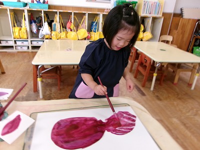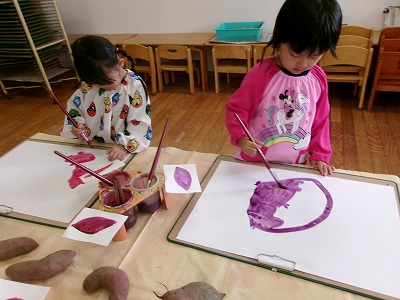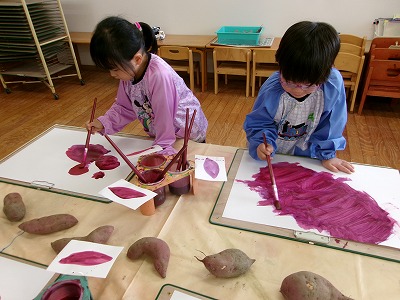 後日、みんなで掘った色々な大きさ、形のさつまいもを絵具で描いてみました。