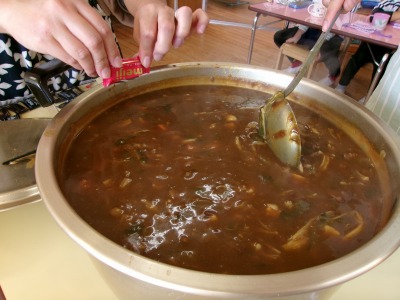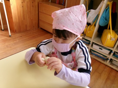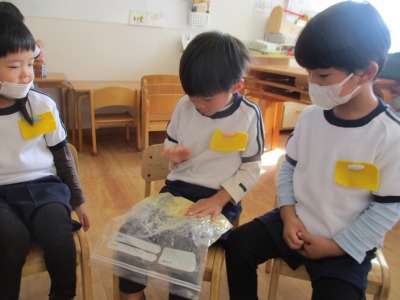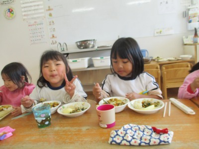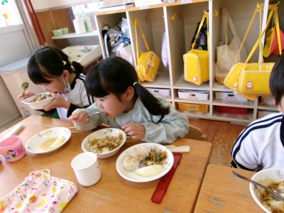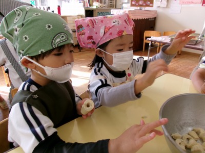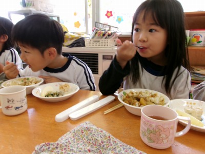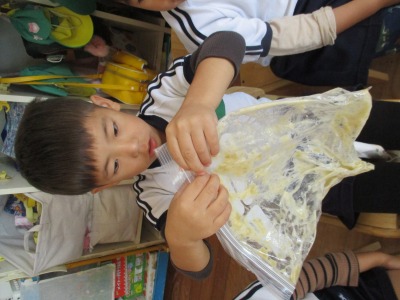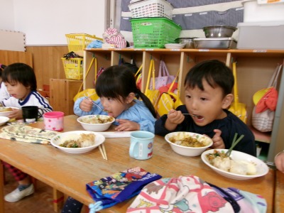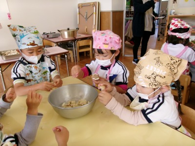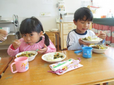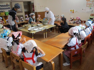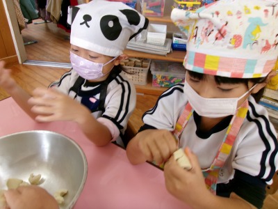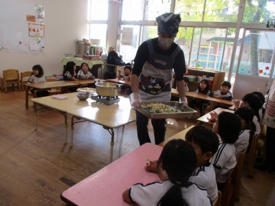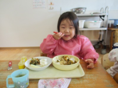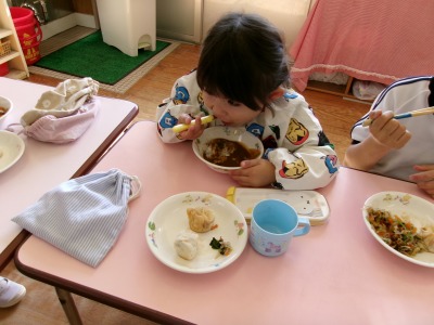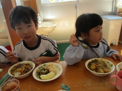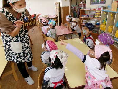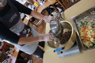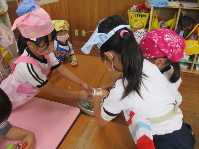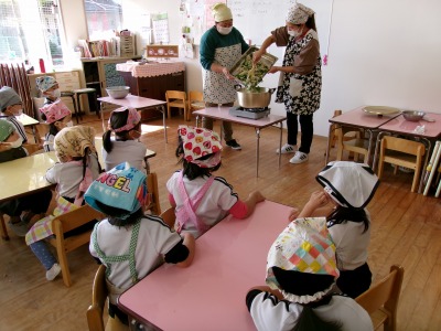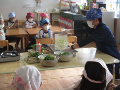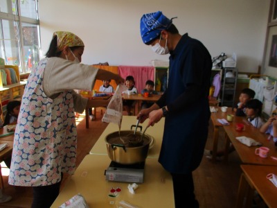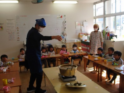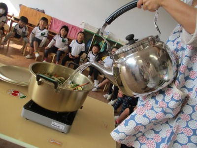異年齢グループに分かれて子どもカレー会議で決めた隠し味を入れます🎶