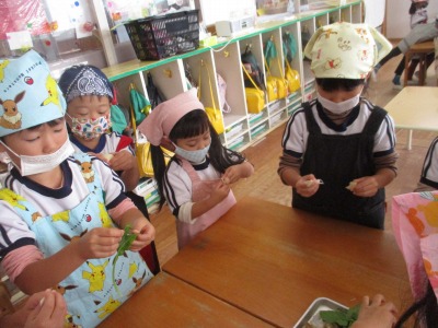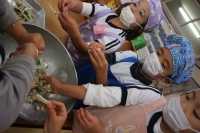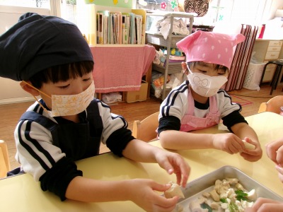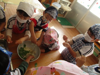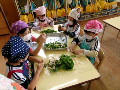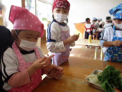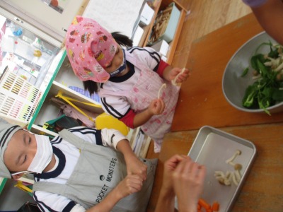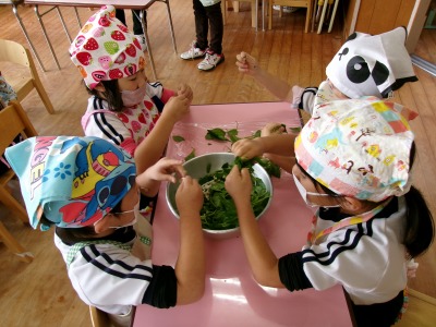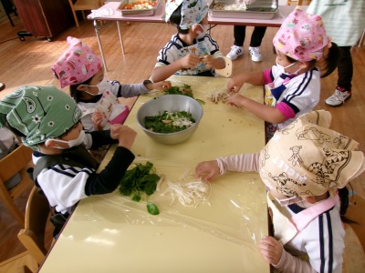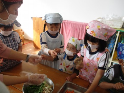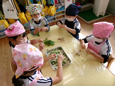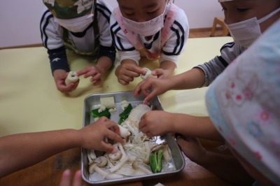 野菜やきのこを手でさいたり小さくちぎったり🥬🍄🥕