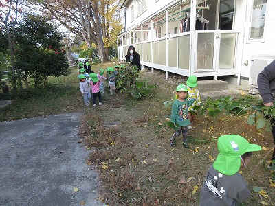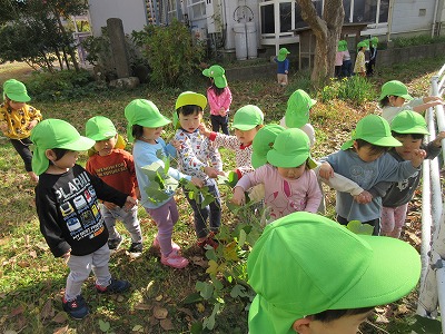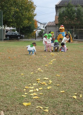 先日、外に出ると、Y君が「せんせー、どんぐりがあんまりない!!」と、一大事だといわんばかりの勢いで教えてくれました。たしかに、毎日持ちきれないくらい落ちていたどんぐりが片手で持てるくらいしか落ちていませんでした。自然の変化、季節の変化に気づいたこと、それを言葉でお友だちや保育教諭に伝えてくれたこと、成長を感じてうれしく思いました(*^-^*)