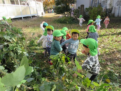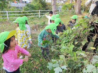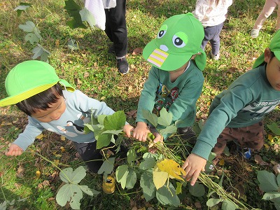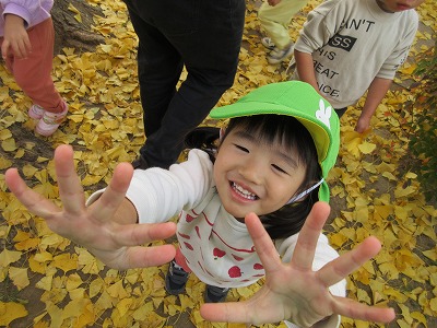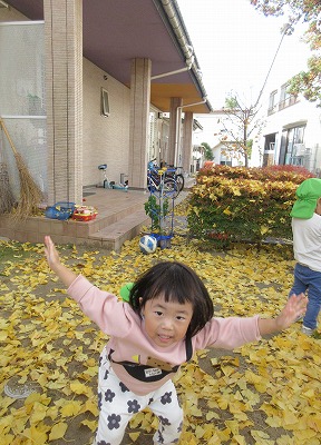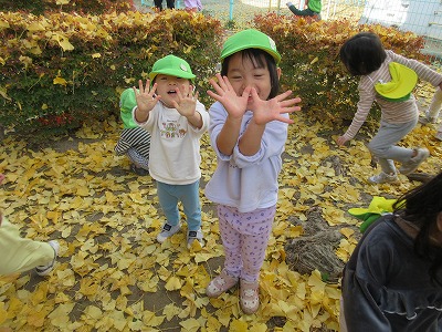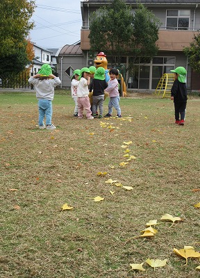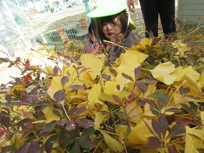 イチョウの葉っぱをたくさん集めよう!!と、大きなビニール袋にみんなで山もり入れてお部屋に持って帰ろうとする子どもたち。力を合わせてよいしょよいしょと運んでいました。