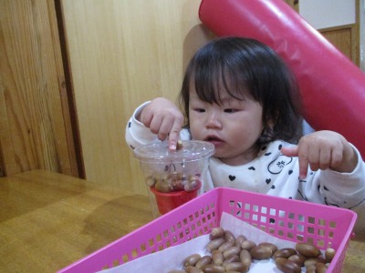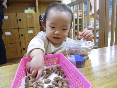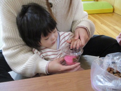 コップの中に頑張ってどんぐりを入れる子どもたちです。