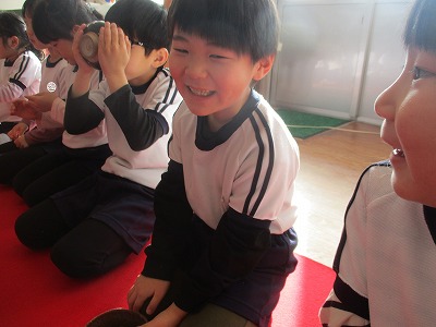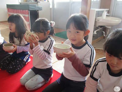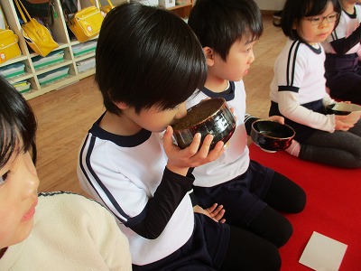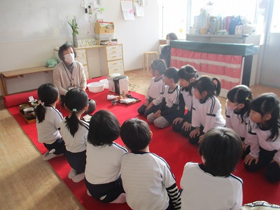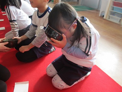 新年の教育初めの今日は、園長先生がお茶会を開いてくださいました。 赤いじゅうたんが敷かれ、いつもと違う保育室の雰囲気にちょっぴり緊張気味の子どもたち…。