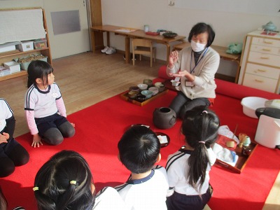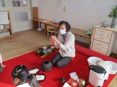 園長先生が、お茶のお道具の説明をしてくださいます。初めて見るお道具に、興味津々‼