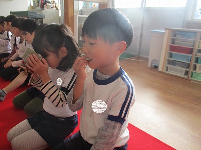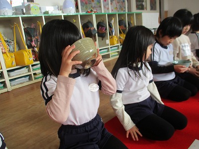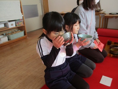 干菓子と一緒にお抹茶を頂きました。「にが~い‼」「おいしい!」「お菓子がおいしい♡」と子どもたちの反応も様々‼日本の伝統文化に触れる貴重な体験ができました♪