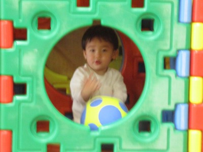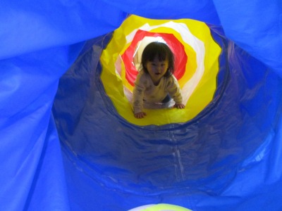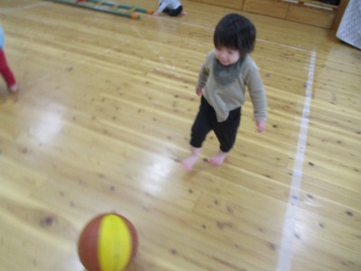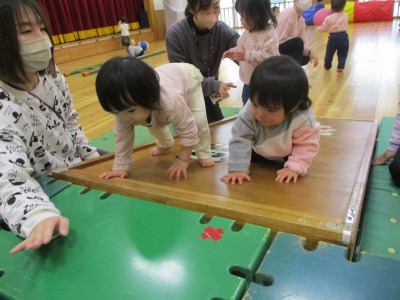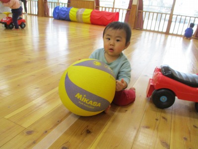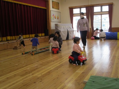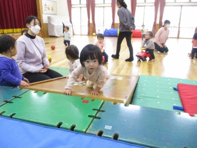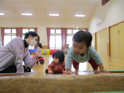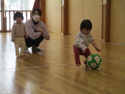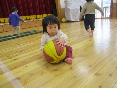 ホールは、天気の悪い日や外が寒いときなどに遊んできた場所!初めての遊びやホールの広さにも少しずつ慣れ、保育教諭と一緒に今日も一緒に楽しく遊んでいます。