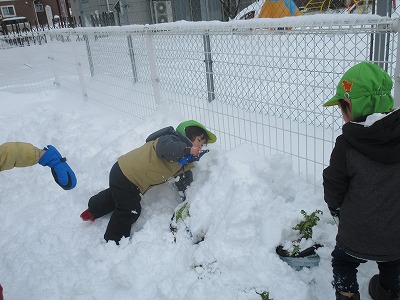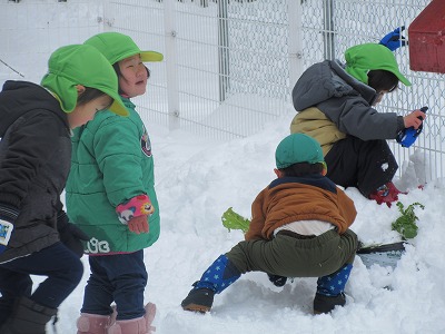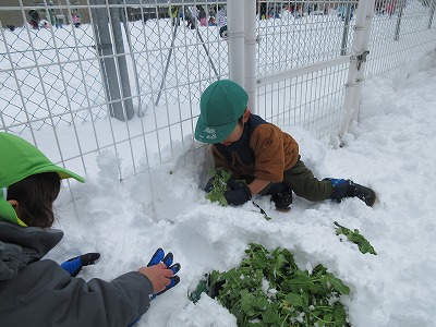 まだ数回しか雪を見たことのない子どもたち。雪を触って冷たさを感じながらも、雪玉をぎゅぎゅと手で固めて作ったり、みんなで大きな雪だるまを作ったり、友だち同士のかかわりが雪遊びを通して広がっていました。雪に埋もれた白菜と大根も一生懸命掘り出していました。