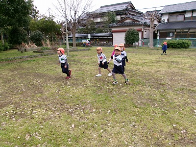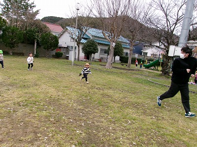 広場を追いかけっこ。暑くなって上着を脱ぎました。