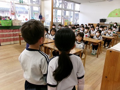 準備ができたので、ホールへお招きするためにほし組さんを呼びに行った時の様子です・・・緊張が後ろ姿から伝わってきます・・・。温かく見守ってくれるほし組さんはお兄さん、お姉さんの表情ですね。