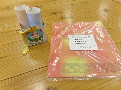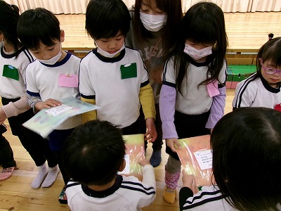 ほし組さんからにじ組さん、つき組さんへプレゼント・・・。子ども達それぞれに個人シールがあるのですが、そのマークを描いたキーホルダーをいただきました。