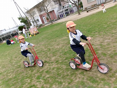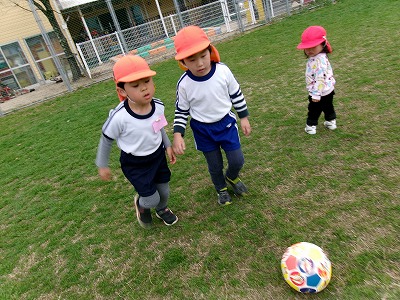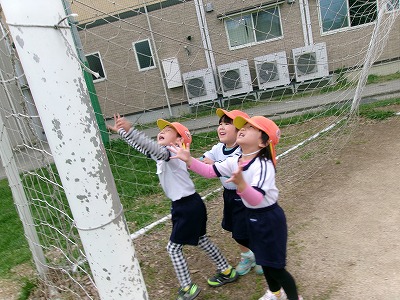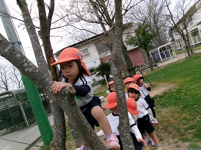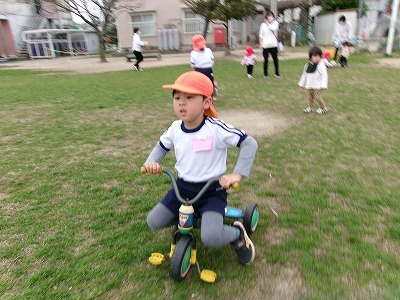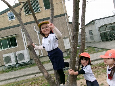 グラウンドへ出ると、虫探しをしたり、木登りしたり、三輪車に乗ったり、ボールを蹴ったりして…