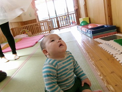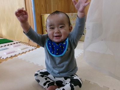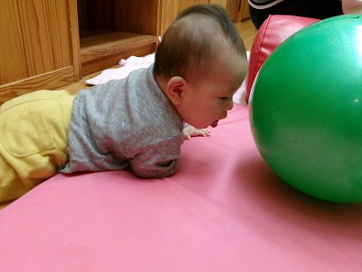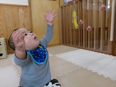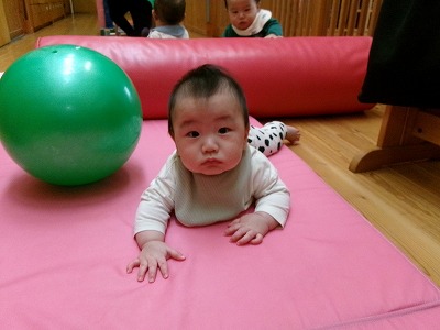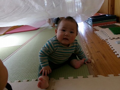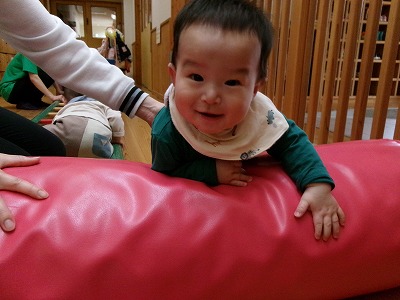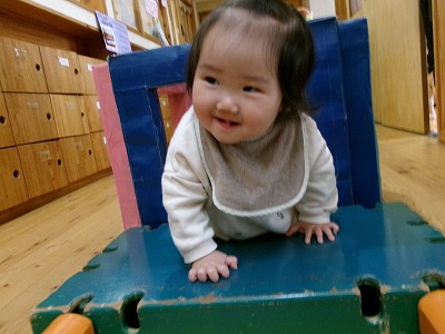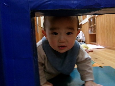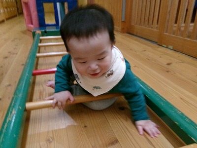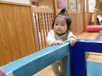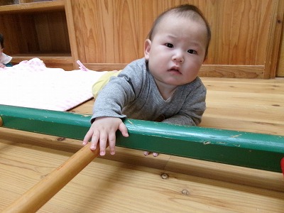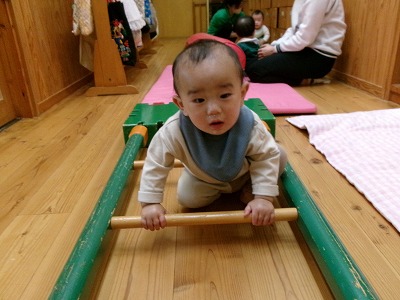 廊下に運動器具や手作り玩具を設置して、ずりばいやハイハイ、つかまり立ちをして遊んでいます。ハイハイではしごの上を超えることができたり手作り玩具につかまり立ちをしたりとよく動くようになってきました。ずりばいをしているお友達も興味津々です。