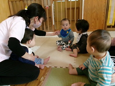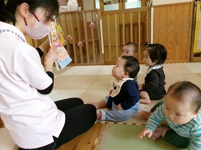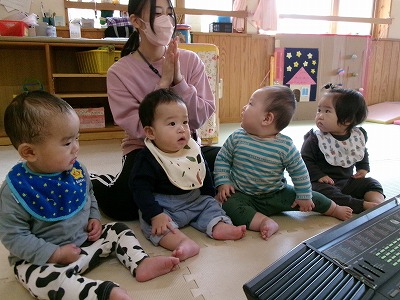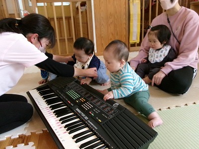 月に一度の初めてのお楽しみ会では、初めに保育教諭が歌をうたうと、キーボードに興味を示し、触りたくて覗き込んだりしていました。絵本もお座りしてじっとみていました。