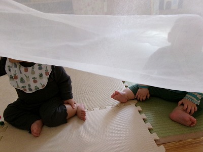 そして登場したのがシオンというふわっとした質感の布。頭の上でゆらゆら揺らすと不思議そうにしたり喜んだり、ちょっぴり苦手なお友達もいたり反応は様々でした。