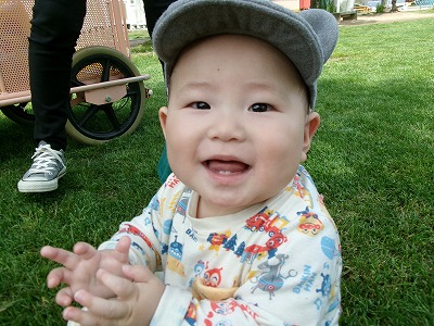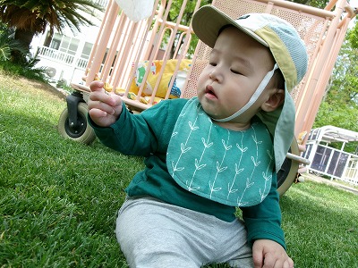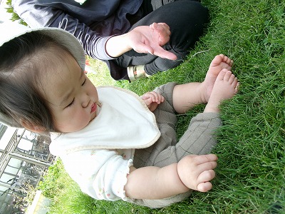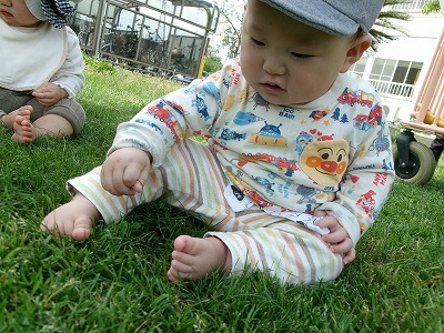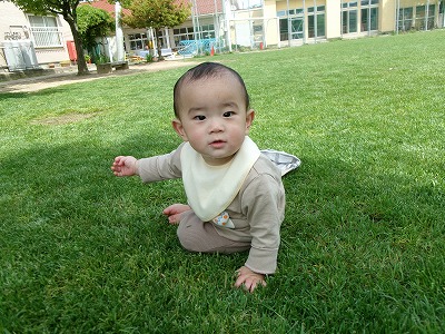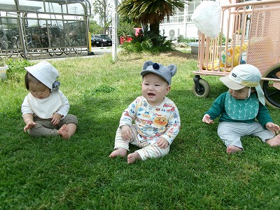 お天気の日はグラウンドの芝生で日向ぼっこ。少しずつ芝の感触にも慣れてきたようで、笑顔がみられるようになってきました。芝をむしったり落ちている葉っぱをさわってみたり、思い思いに楽しめるようになって