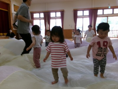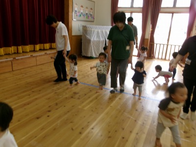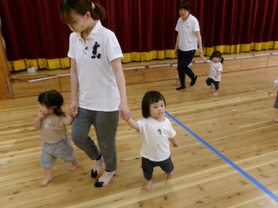 みんなで手をつなぎ、『さんぽ』の曲に合わせてホール中を歩いたりジャンプしたりしました‼