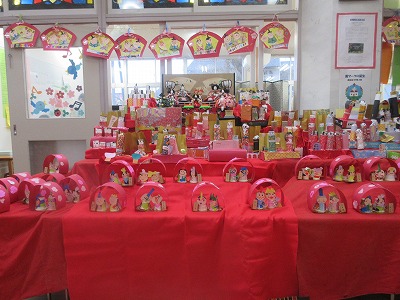 今日はおひな祭りと誕生会がありました。各クラス、お雛さまを作ってならべました。 まずは年少さん 折り紙を折ってお雛様を作