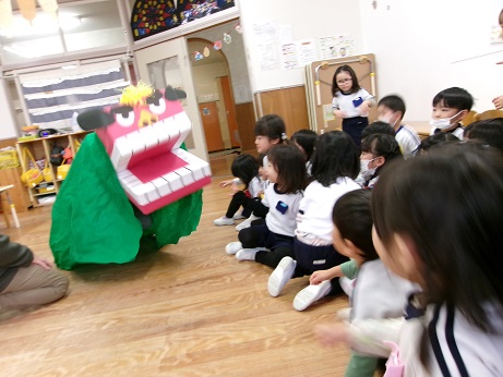 正月明けのある日、にじ組にお囃子の音と共に、かわいいししまいがやってきました。 突然のししまい登場に少しビックリ!!後ず