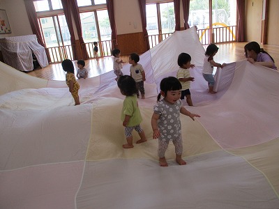 わらべ歌遊び「うえからしたから おおかぜこい」を楽しみました。 職員が「うえからしたから おおかぜこい こいこいこい♪」