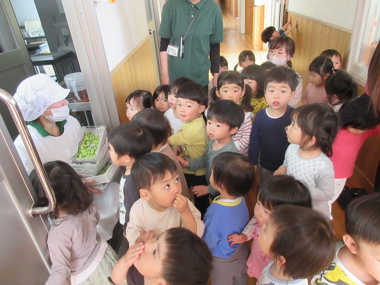 先日、「そらまめくんのあたらしいベッド」の絵本を読み、そら豆という野菜を知った子どもたち! そしてなんと表先生がそら豆を