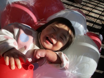 ひよこ組の子どもたちが大好きな風船でたくさん遊びました!! 風船マットの上に座ってぽよんぽよん♪ ごろ~ん、気持ちいいね