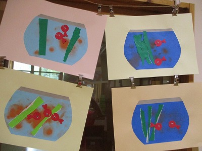 今月は「きんぎょがにげた」の制作をしました😌 最初に緑と黄緑の折り紙をビリビリ~っと 破っていきます! 次はスポンジに絵